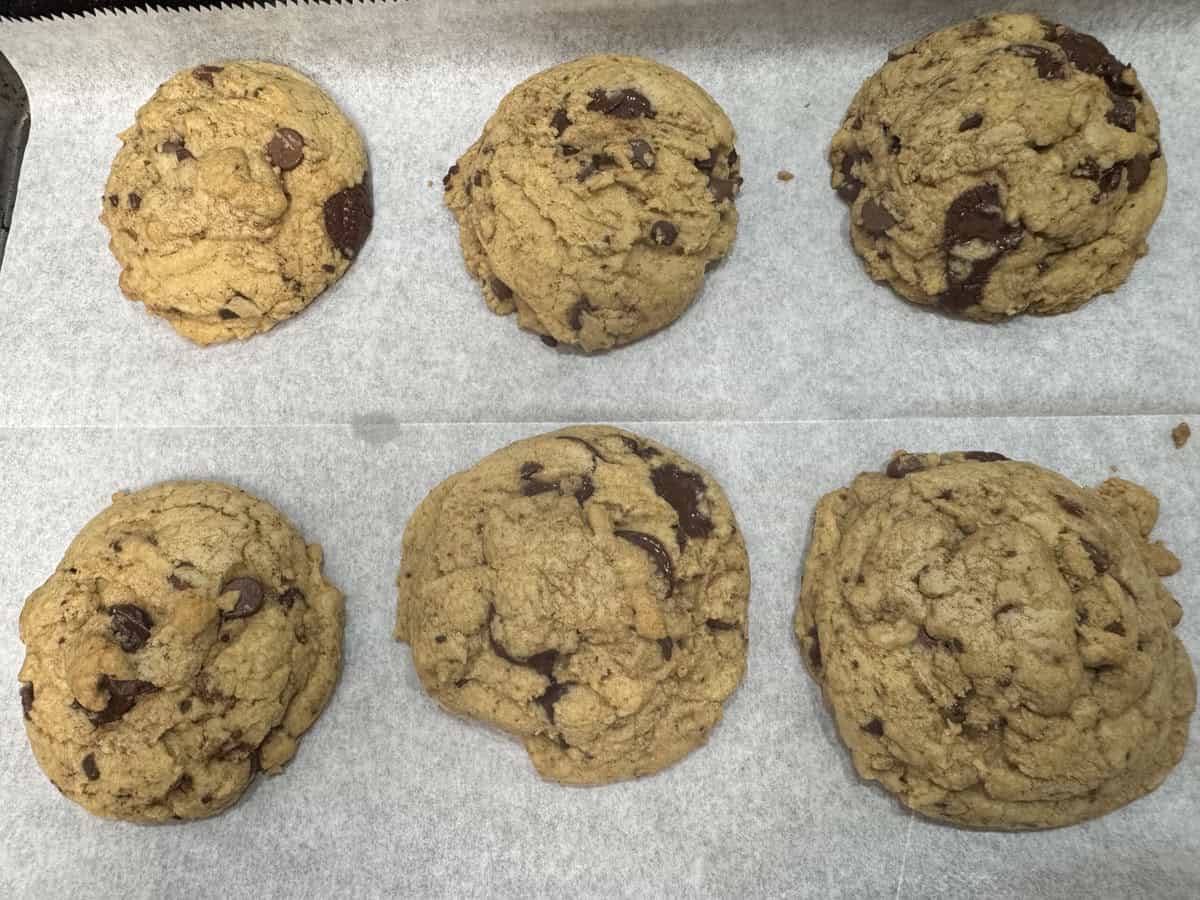 Form Cookie Balls: Scoop the dough into 16 very large dough balls and place on a cookie sheet. I use an extra large cookie scoop that holds about 4 tablespoons of dough!