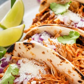 - Warm tortillas on the stovetop (or wrap in a damp paper towel and heat in the microwave) and serve filled with shredded chicken and your favorite toppings!