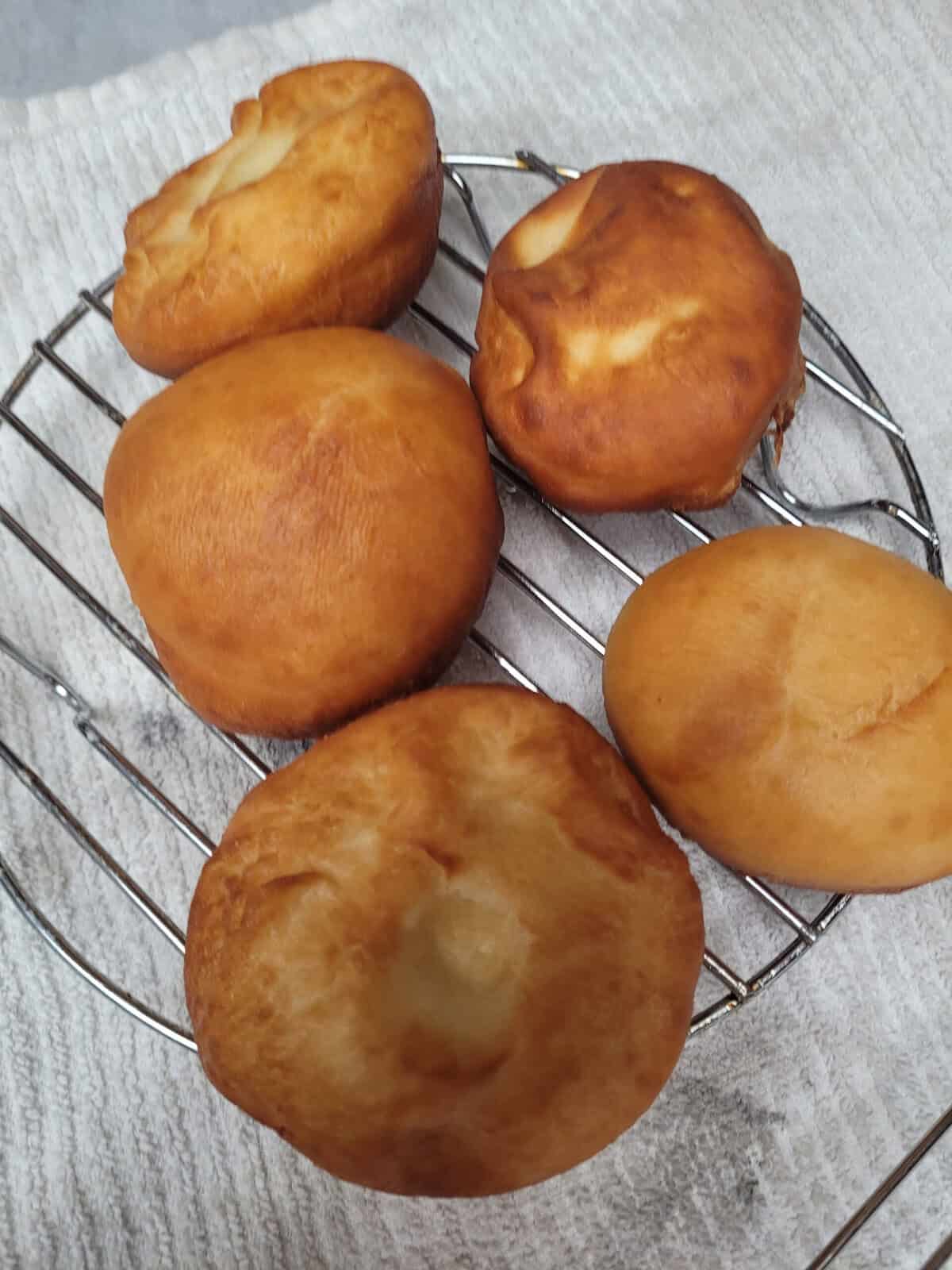 - Once the donuts have risen and the oil is hot, carefully place 2 – 3 donuts at a time into the hot oil, and fry them for 1 – 2 minutes per side. When they are done, place them on the prepared cooling rack.
