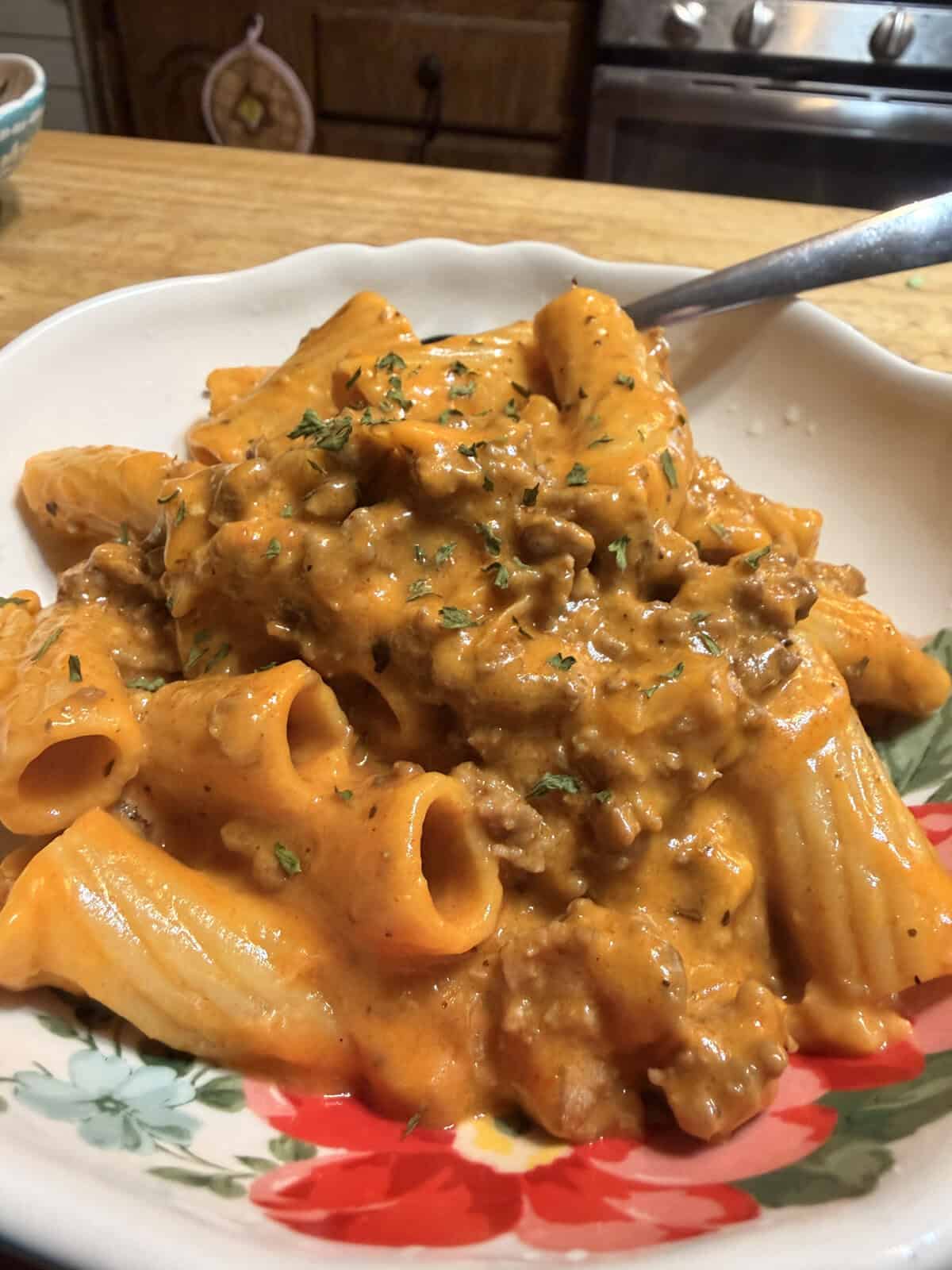 Made with heavy cream and real cheddar cheese, every bite features tender pasta and savory ground beef smothered in a rich and cheesy sauce. It’s the perfect family-approved weeknight dinner!