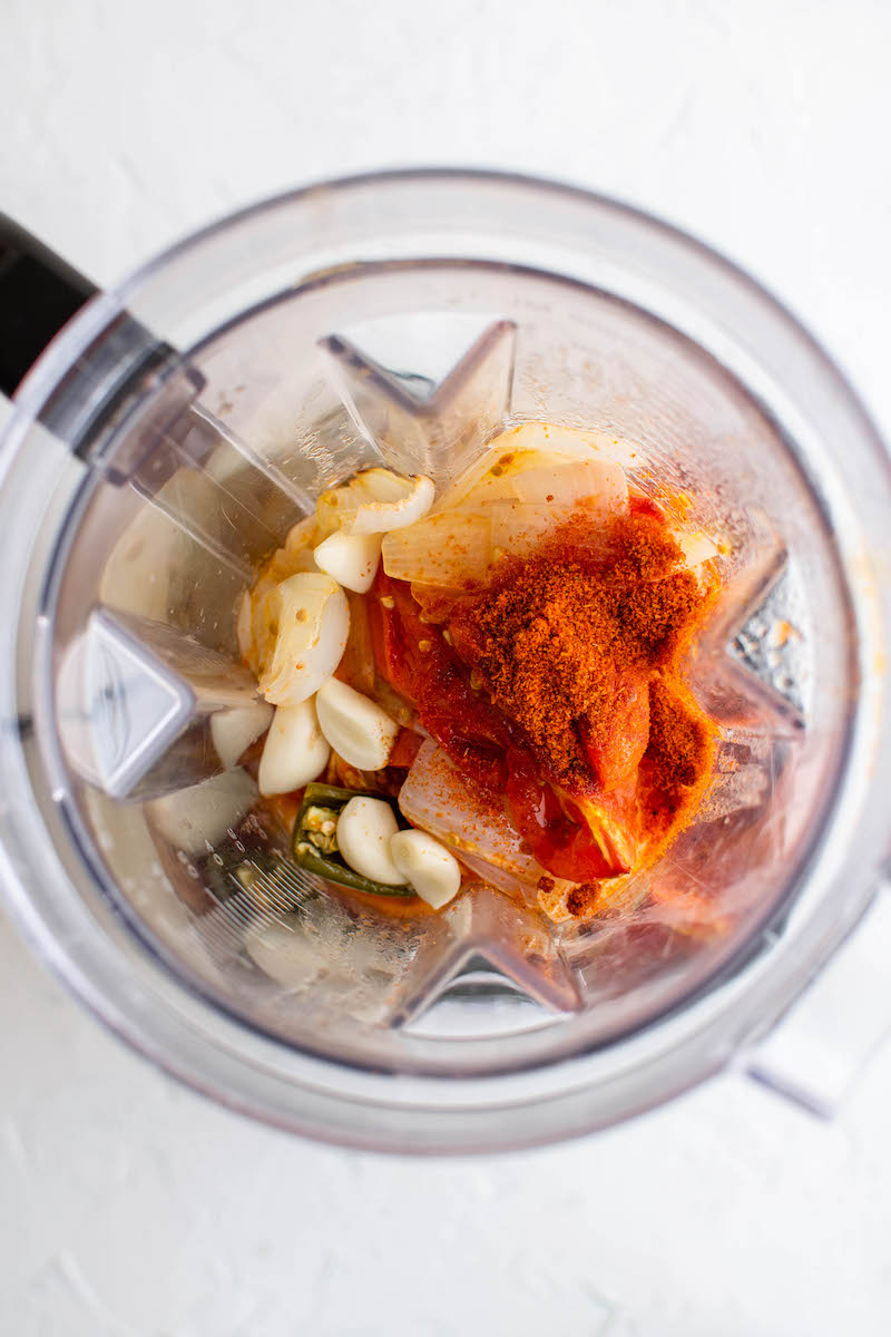 - Add roasted vegetables to a blender along with the garlic and tomato bouillon. Blend until smooth and add more salt to taste, as needed.