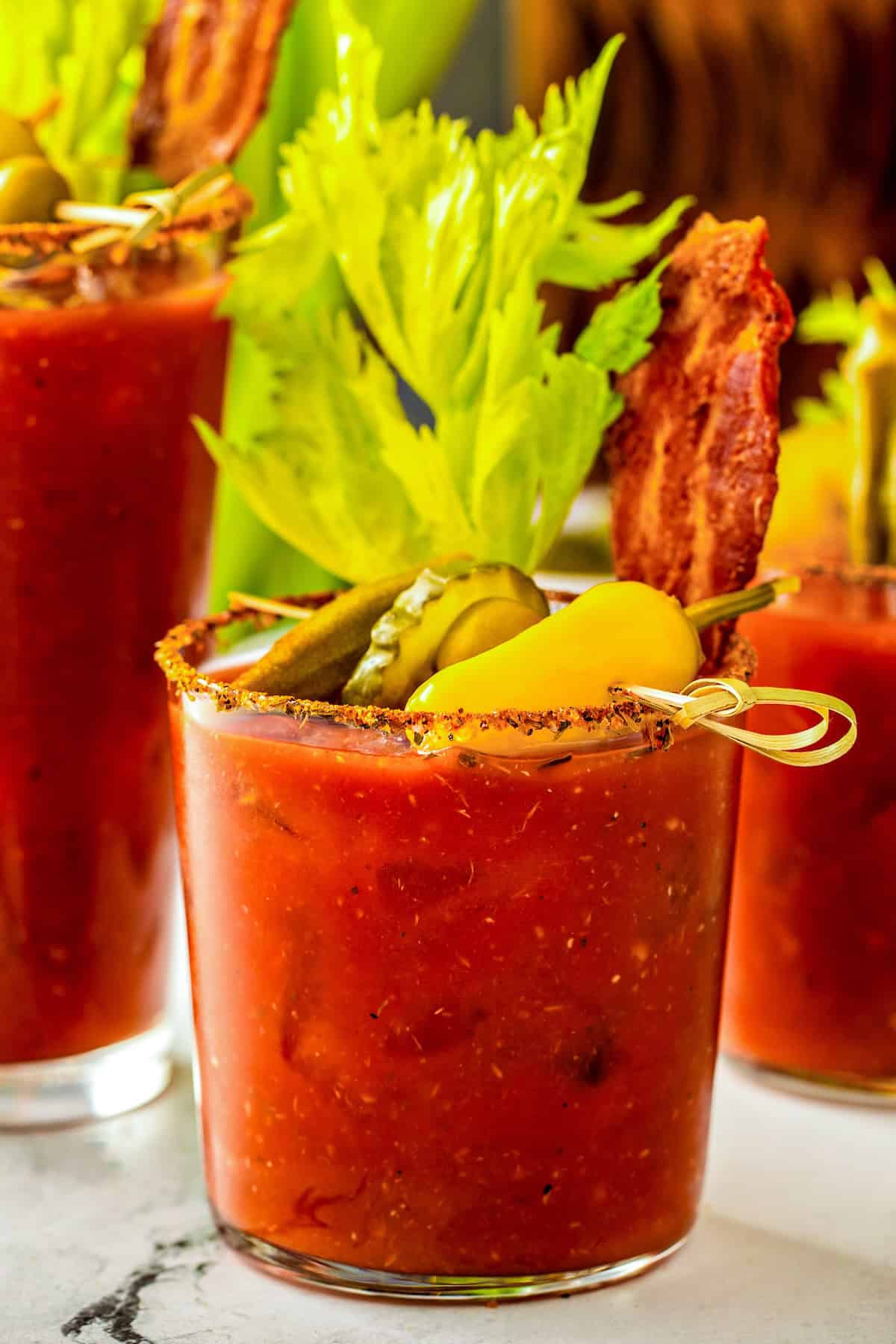 The key to a great Bloody Mary recipe is all in the spiced tomato mix. This version starts with a rich tomato base that’s loaded with lots of spices and seasonings so it’s got the perfect balance of heat and savory goodness. Even better? The tomato mix can be made the day before! A fully loaded Bloody Mary is the only way to go in my house, so when it comes to the crunchy garnishes, I LOVE to really stack them high. Big flavor and even bigger presentation is what it’s all about with this drink!