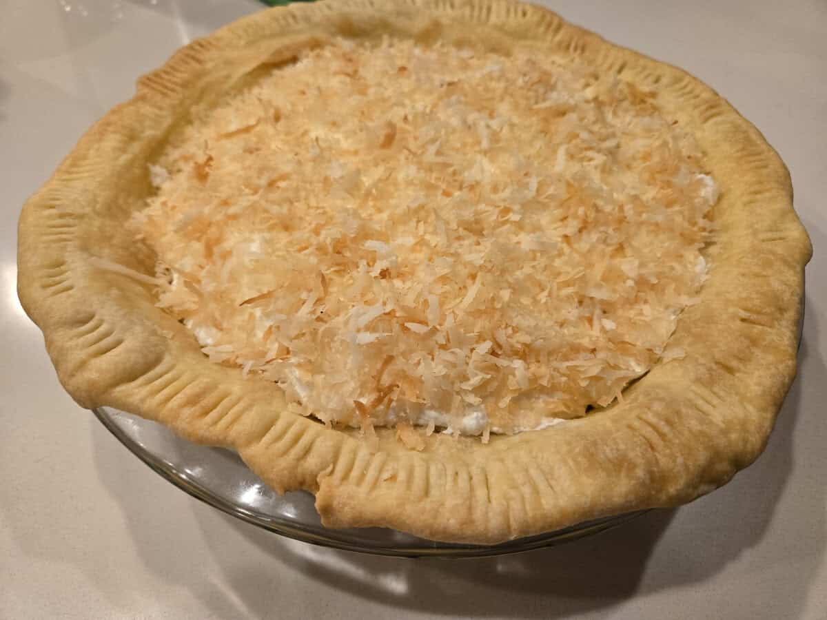 - Serve pie topped with fresh whipped cream and toasted coconut.