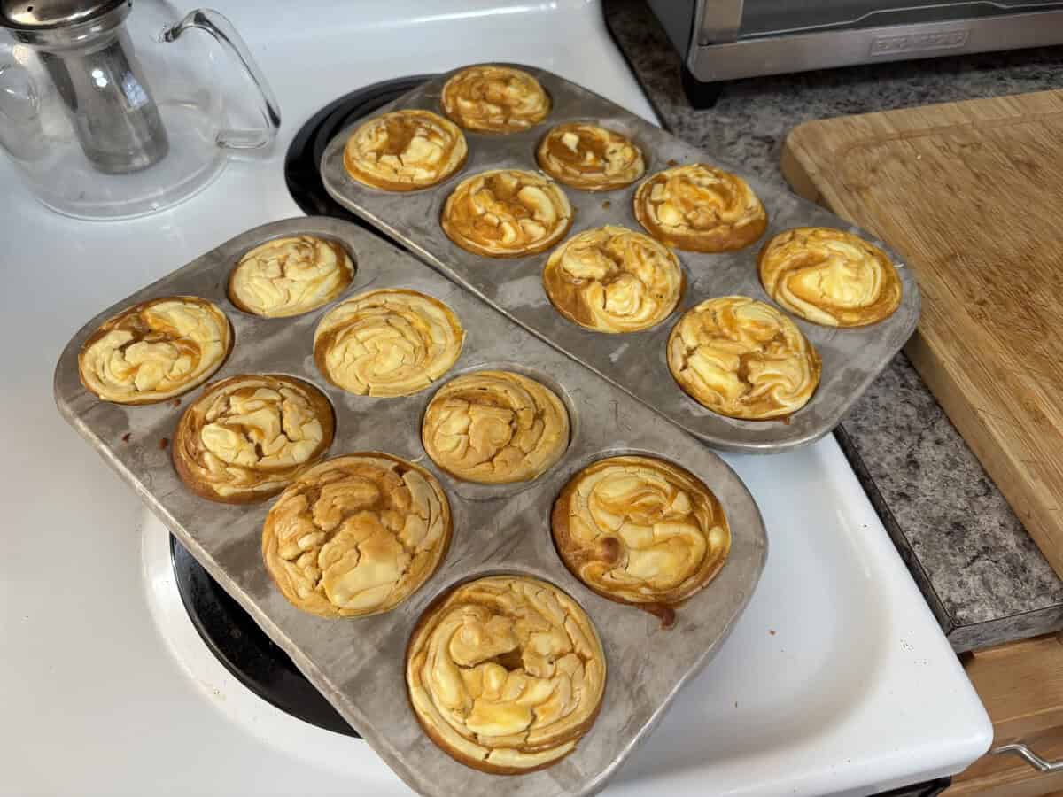 Great recipe! Have made them twice! Second time, I saved a little muffin batter in icing bag to swirl over the cr. cheese (before baking), to give them cinnamon-roll effect.