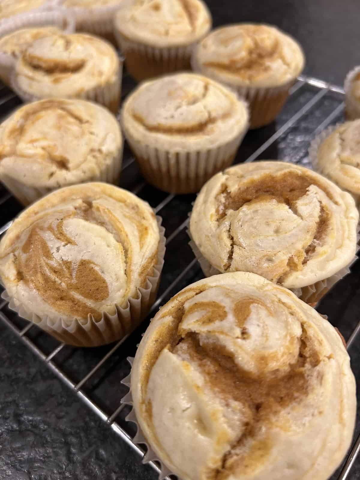 Keep a close eye on the bake time. Every oven bakes a little differently, so I recommend checking them around the 18-minute mark. They are done when a toothpick is inserted into the pumpkin part (not the cream cheese swirl) and comes out clean or with a few moist crumbs.
